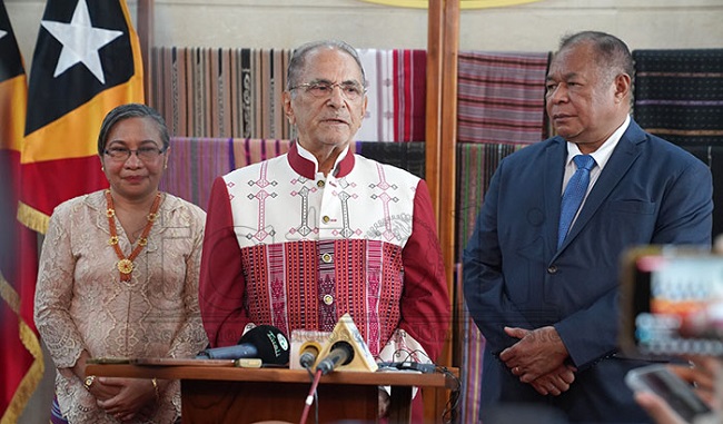 Presiden Republik, Jose Ramos Horta berbicara kepada media didampingi Menteri Luar Negeri dan Kerjasama, Bendito dos Santos Freitas, Wakil Menteri, Jesuína Maria Ferreira Gomes usai acara pelantikan yang digelar di Istana Kepresidenan Nicolau Lobato, Dili, Kamis (05/03). Foto TATOLI/Egas Cristóvão