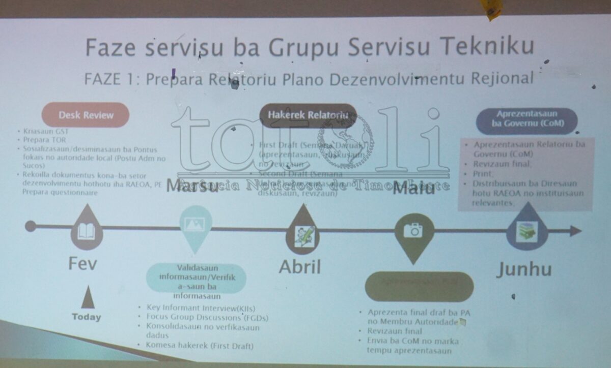 Entretantu, Grupu Serbisu Tékniku ne’e mai husi Diretór no Xefe Departamentu inklui funsionáriu permanente no durasaun ba elaborasaun Planu Estratéjiku Dezenvolvimentu Rejionál ne’e durante fulan-haat sei finaliza iha fulan-Juñu 2026 hodi aprezenta ba Konsellu-Ministru atu hetan paresér no aprovasaun.