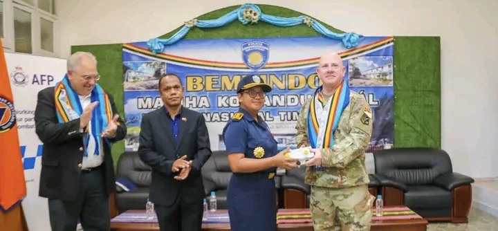 Vise-Xefe Misaun Embaixada EUA, Rodney LeGrand entrega simbólikamente apoiu ba , Segundu Komandante PNTL, Komisária Asistente Natercia Eufrásia Soares (dahuluk husi liman loos), perante Sekretáriu Estadu Protesaun Sivil, Domingos Mariano Reis no Reprezentante husi Embaixada EUA iha Dili, iha Kuartél Jerál PNTL, Kaikoli, Kuarta (01/04/2026). Imajen/Natalino da Costa
